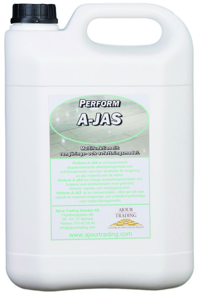Perform A-JAS är ett universellt rengöringsmedel som tar bort och löser effektivt vattenlöslig smuts samt fläckar av mineral- och syntetisk olja, sot, fett, tjära, asfalt, vägsalt och gammal fastbiten smuts. Påverkar ej färger, etsar ej glas eller aluminium, reagerar ej med betong eller mattor av typ linoleum, PVC, gummi, trä samt natursten.